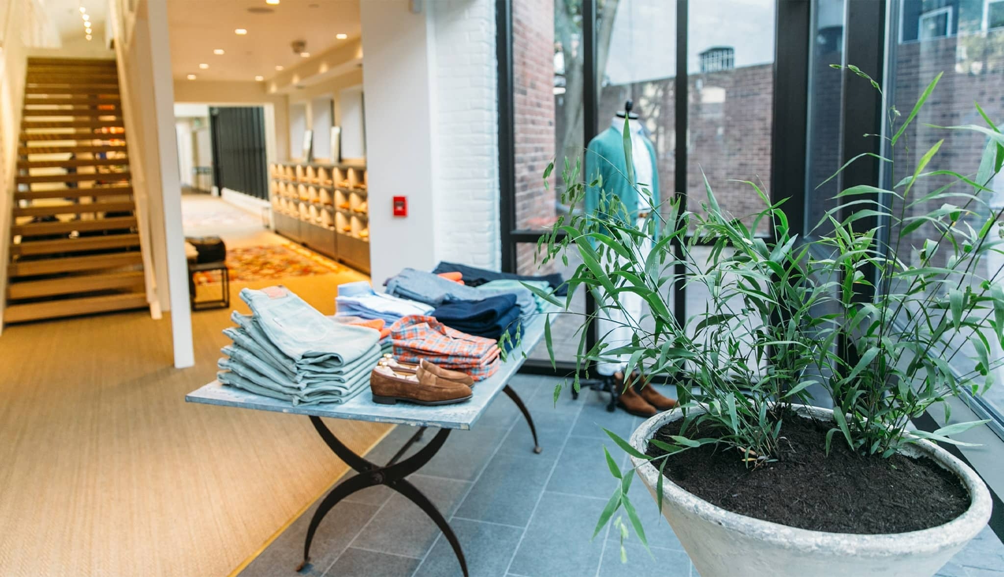 You can also come in through our women’s shop, located on Prospect Street above Brasserie Liberté. The shops are connected inside through a shared atrium, so you can enter from either side. We'll have smiling faces to greet you, something great on the turntable, and a cold Topo Chico or Miller High Life at the ready.
