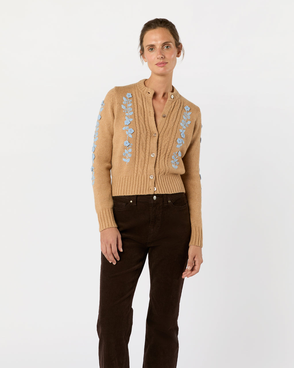 But finally I am getting to the clothes. This season you will see touches of my Alpine fantasy all over the collection. Some Swiss-inspired lace… leather novelty belts with an Austrian vibe… and a few sweaters embroidered with the flowers of the Engadin. But the easiest way to wear what I am feeling is our Tyrolean jacket. We ran this style last year and I wore it to death. One of my favorite things on the line. Last year’s brown has become this year’s beautiful charcoal grey that goes with just about anything… plus a pretty turquoisey blue and a bright navy. I had a hard time deciding which one I needed. It is sort of a sweater, so it is a softer version of what you might remember as Maria Von Trapp’s traveling outfit in the Sound of Music. Not at all costumey… just cool and classic and a touch folkloric. It has the stand-up collar of a men’s Trachten Jacket and beautiful brass buttons with little edelweiss flowers stamped on them.