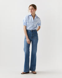 Stockholm-based Jeanerica is our latest favorite minimalist denim line, specializing in “essential styles in perfect fits with understated details and expert washes.” Sounds pretty good to us. The St. Monica is a sailor-style silhouette with a super high rise, a flared leg, and patch pockets. This pair is made of mid-blue organic denim.