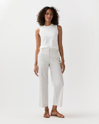 The Frankie is our latest take on an easy trouser shape, with a Hollywood waistband (which is an industry way of saying the band is invisible). The rise sits right at the natural waist, with a relaxed fit through the leg and a slightly cropped hem. This particular pair is made up in the most fantastic crinkle cotton and linen blend from Italy and finished with pockets carefully constructed to lay flat against the body for a streamlined fit.