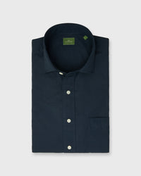 A solid navy shirt is very cool — it gives a softened-up-Johnny-Cash vibe — and easier to wear than you'd think. Jeans, cords, khaki pants, sky's the limit. This one is made from fine, 2ply/2ply Italian poplin and has a modified spread collar with lightweight, nonfused interlining for a soft, relaxed look. The cut is slim but never skinny, with a high armhole for mobility and a shirttail long enough to stay tucked in. (Sid likes it this way, but it's easy to shorten if you prefer.) It's made with single-needle stitching, 22 stitches/inch, flat-felled seams, and thick, 3.5mm Trocas shell buttons.
